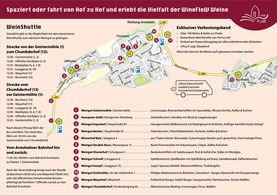Nach der Veranstaltung bringt euch der Shuttle ab Bornheim (18:30 Uhr) und Meyerhof (18:40 Uhr) oder die öffentlichen Verkehrsmittel (kostenpflichtig) ab Flonheim / Uffhofen zurück an den Bahnhof Armsheim.