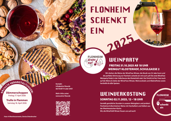 Wir drehen die Weine der WineFlow Winzer, die Musik von DJ Jake Gunn und die perfekte Stimmung vor Flonheim schenkt ein mit euch auf! Die erste WineFlow Weinparty findet in der Hofscheune des Klosterhofs statt. Der Eintritt ist frei. Freut euch auf die Weine & Sekte der WineFlow Winzer, Weincocktails und Alkoholfreies sowie herzhafte & süße Speisen.